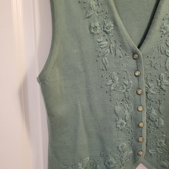 Pleated translucent skirt with a zipper and button enclosure at the back, and an intricately-detailed knit sweater vest with shiny glass-like plastic buttons. The detailing on the vest is floral themed, with flowers, leaves and vines knit on.