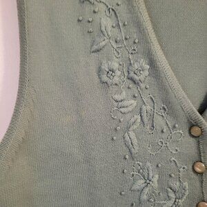 Pleated translucent skirt with a zipper and button enclosure at the back, and an intricately-detailed knit sweater vest with shiny glass-like plastic buttons. The detailing on the vest is floral themed, with flowers, leaves and vines knit on.