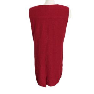 Embrace the elegance of this wool shift dress from Talbots. The knee-length dress features a V-neckline, sleeveless design, and a zippered front closure that adds a touch of sophistication to any casual or business occasion. The dress comes in a solid red color that exudes a minimalist and classic vibe. Crafted with 100% wool, the dress is perfect for winter, fall, and spring seasons. It features a slit backside and pockets for added convenience. The dress is lined. The dress is perfect for those seeking quiet luxury, and it suits the vintage theme.