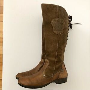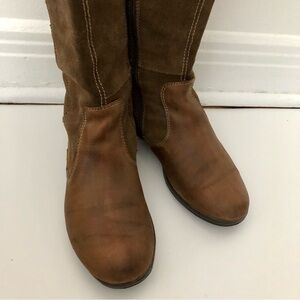 Step into rugged style with these vintage Western-style boots, full of authentic charm and well-worn character. Featuring vintage flair and crafted from premium brown suede and leather quality construction, these boots are perfect for anyone who loves a lived-in, rustic look. They feature an adjustable lace-up back for a customized fit and a zipper closure for easy wear.They show obvious signs of wear including a tear on the back of the right boot. Despite this, the interior lining is fully intact, and he boots still have plenty of styling potential — ideal for photo shoots, costume wear, or vintage fashion lovers who appreciate aged leather and distressed details. Details: • Style: Vintage Western-inspired high-knee boots • Material: Brown suede and leather • Features: Lace-up back, side zipper closure • Condition: Distressed and well-worn • Notable wear: Tear on back of right boot (see last photo), natural patina, scuffing, creasing, general signs of age • Lining: Intact Size 7.5-8 Vintage Western Style Boots – Distressed Leather – Well-Worn with Character