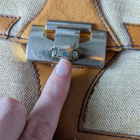 This lovely vintage top handle handbag is in good vintage condition. There is all over yellowing from exposure (noticeable when you compare the exterior canvas to the interior canvas below the flap. There is also weathering to the leather in a few places, and the top handle has missing stitches which have allowed the center to separate.