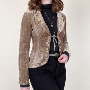 Elegant velvet blazer with floral embroidery. Features a stylish tie closure. Perfect for sophisticated occasions.