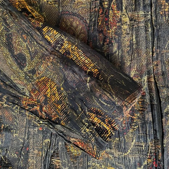 Glittery tapestry jacket with purple, tan and gold pattern. Light weight, loose fit, shoulder pads. 80's grandma leisurewear goes to the club.