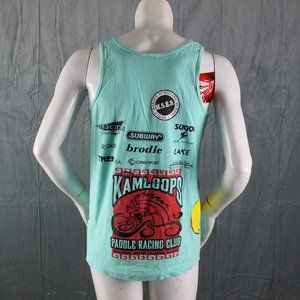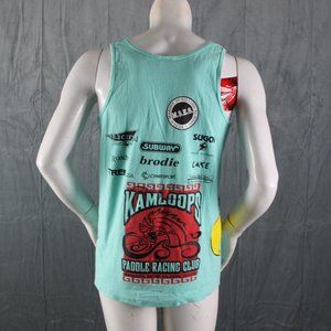 Up for sale is a vintage graphic tank top. It has a marine green base colour and is an all-over graphic print. The front of the shirt has the Kamloops rowing club logo several times with a few maple leaves. One side of the shirt has a cartoon hawk graphic with the other side has the Canadian and Australian flags crossed. The back of the shirt has several sponsor logos and the Kamloops dragon boat team logo. What a great vintage tank do not miss out on it.