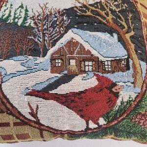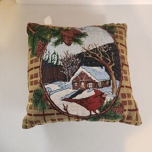 Vintage Tapestry Decorative Pillow Red Cardinal Winter Farm 15" Square Christmas
