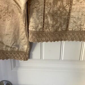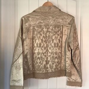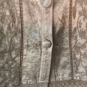 Beautifully detailed vintage jacket in cotton (70%) and silk (30%). Covered buttons. Two small breast pockets. Crochet trim. Beige in color. 1.5 pit to pit and 21.5” length. Great used condition.