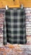 A classic and Stylish plaid skirt in black and gray. It’s a wrap style with a button closure and traditional silver pin on the side. It’s straight in the front and pleaded in the back. A quality piece made from virgin wool. Made in Canada.