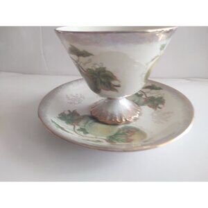 This footed lusterware tea cup and saucer set has a beautiful iridescent, pearlized aurora borealis finish. You can see the rainbows in the background. The foreground is green melons, leaves and vines.