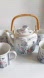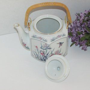 Charming porcelain tea set. Includes hexagon teapot with rattan handle and four generously sized mugs suitable for tea or coffee, all decorated with pink and blue irises and birds.