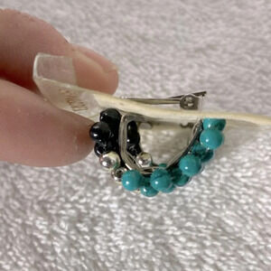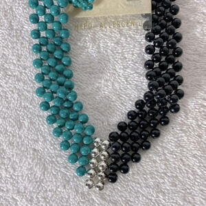 Vintage Teal Black Silver Plastic Beaded Necklace & Clip On Earrings Set