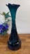 This stunning vintage teal blue art glass vase features a dramatic twisted swirl pattern and an elegant flared ruffle rim. Likely made by Marshall Fields, it showcases a rich ocean-deep colour that shifts in the light from vibrant teal to inky blue. This piece is substantial in size and weight, making it a true statement décor item for collectors and design lovers alike.