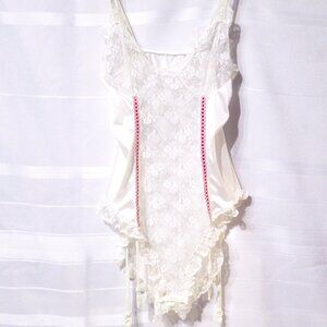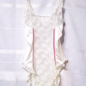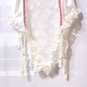 Pretty teddie romper bodysuit in a size medium. All silky soft sheer white nylon and lace with pretty lace flutter legs on the panty. Snap closure. This teddie features adjustable garter straps so you can wear your prettiest thigh highs with it! Excellent vintage condition, except the tags have been removed. The most important measurement of this teddie is from the top of strap to the bottom. The straps are non-adjustable. It measures about 36 inches from fully extended elastic strap from top to bottom of the snaps. It's also up to 18 inches from underarm to underarm. I think it would fit well for anyone with up to a 34 inch chest size. So pretty!