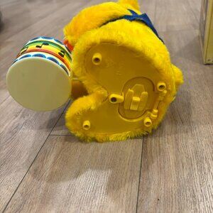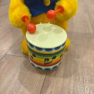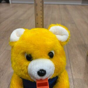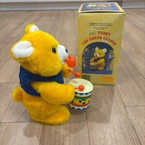 Vintage Teddy the Cheerleader Bear toy from the 1980s. This adorable yellow plush measures approximately 9" tall x 5" wide and features a cute blue vest and a drum with drumsticks.