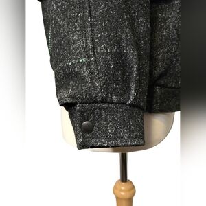 vintage Tempo Europa by London Fog bomber jacket, made in Canada. Crafted from a reclaimed wool blend (75% wool, 20% nylon, 5% other fibers), it offers both warmth and durability, lined with acetate and insulated with polyester fill for comfort.