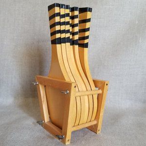 This is a fantastic set of 6 vintage wood tennis racquet shaped coasters and a coaster holder.