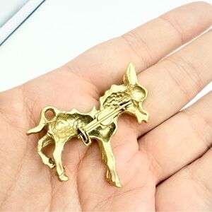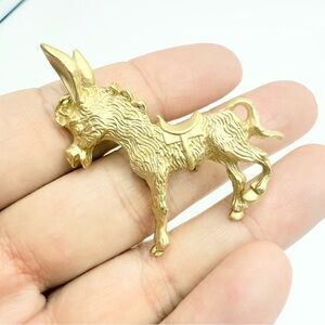 Charming vintage brooch featuring a donkey with a saddle, crafted in a textured matte gold tone finish. Detailed design adds a whimsical touch to any outfit. A unique and collectible piece, perfect for animal lovers or vintage jewelry enthusiasts.