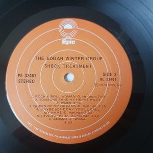 This is the 1974 first pressing of Edgar Winter Group Shock Treatment vinyl record. Epic Records, PE-32461. The album cover, vinyl record, and inner sleeve are original to 1974.
