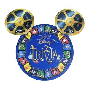 Vintage The Wonderful World of Disney Trivia Game by Mattel 1997 in a round metal tin. This includes an extra game board, second card set and extra parts from a second set we owned. The game has printed instructions and is missing 1 purple chip. With the 2 boards and two card boxes the adults and kids can split up and play separately or you can have up to 8 players if you wish!