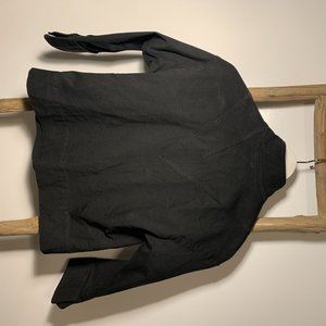 Cute short jacket by Theory. Can be worn buttoned with an almost mandarin collar or worn open for a more casual look. Sits around the pant line, so a great jacket for both informal and formal outfits.