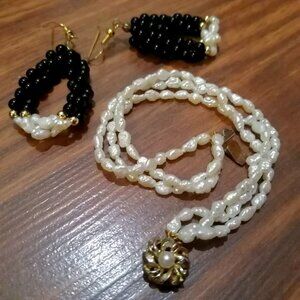 This listing is for a vintage bracelet, maker unknown. The bracelet is made up of three strands of small white freshwater pearls with goldtone findings. The clasp features a single round faux pearl in the centre. When lying flat and undone, this bracelet measures 8" but in terms of wearing it would be about 7.75" because of how the closure works.