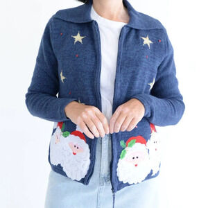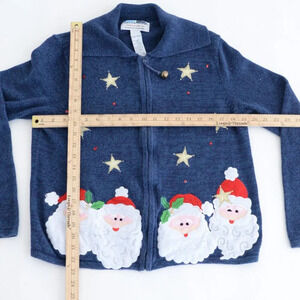 Vintage Tiara Navy Ugly Christmas Sweater Santa Festive Zip Up Cardigan L