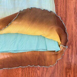 Vintage by Alain Weiz. Lightweight flowing mesh overlay with textured effect in vibrant green, blue, turquoise and brown faux tie-dye pattern. Fabric has some stretch. Button and hidden zipper closure on side. Fully lined underneath with a turquoise slip. Turquoise contrast stitching on seams and lettuce hem. Y2k, festival, boho, grunge, fairycore.