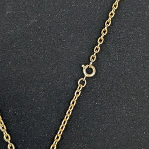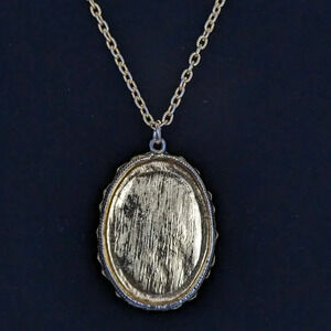 This vintage necklace is a small-link chain made with gold tone metal, and a pendant. The chain has a c clasp closure and has a good length to it. The pendant is a large oval with a detailed border and features a mosaic of tiger eye chips. There is some minor tone loss, but the chips are all in good condition and there are no issues that affect wearability.