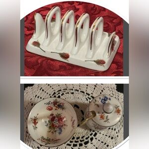 A lovely combination of vintage toast rack, cream and sugar from Hammersley adds a nice Victorian touch to breakfast.