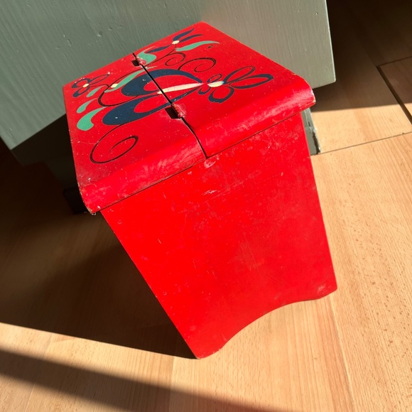 Vintage hand tole painted shoe shine stool with storage. Hinged lid opens to compartment for storage. Good used condition, shows light wear and tear, interior has some stains, see photos for details. Measures approx. 12" x 8.25" x 11".