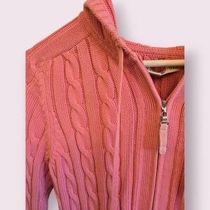 Stylish cable knit sweater. Features a zip-up front with a hood.