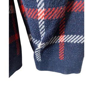 It has a classic dark navy plaid with bright red and white stripes. 9 original button front closure and crew neck.