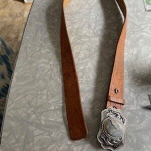 Vintage Tooled Western Genuine Leather Belt with vintage cabochon buckle
