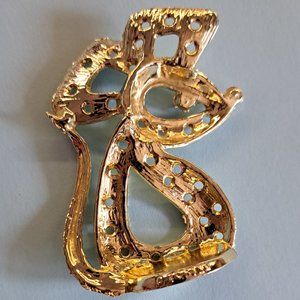 This cute little mouse jewelry holder is in great used condition. It is metal, gold-toned, and has some tiny discolouration specks where the gold tone has worn off.