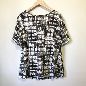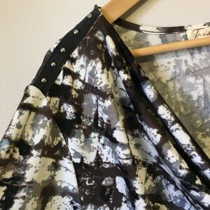 Very good preowned vintage condition, modular ink blot pattern, drape necked t-shirt by Tradition with black fabric shoulder strips and metal studs. Pattern has been created with a combination of black, grey and brown on white. Mature and sophisticated.