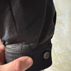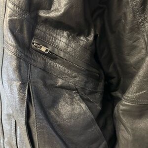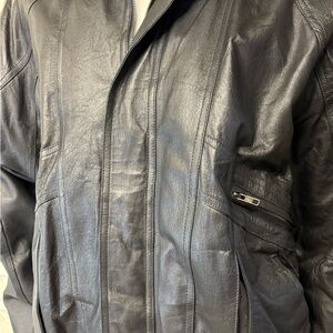 This black bomber jacket features a smooth leather finish and a classic collared neckline, offering a timeless style. Its relaxed fit ensures comfort and ease of movement, making it a versatile addition to any wardrobe. The supple leather material adds a touch of luxury to this essential outerwear piece. One small stain on interior lining.