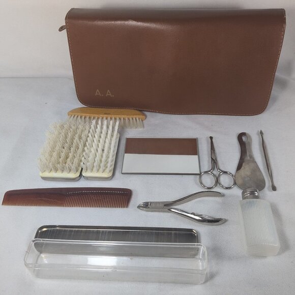 Vintage Travel Shaving Grooming Kit Brown Zip Genuine Leather Case Brush A. A. Germany