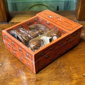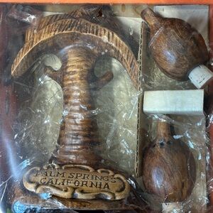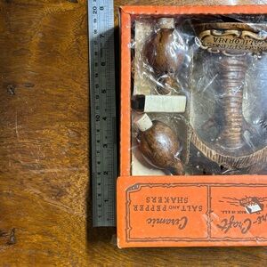 Vintage Treasure Craft souvenir Palm Springs California palm tree salt and pepper shakers. Made of ceramic, brushed with paint for a faux woodgrain effect. This set is still in its original packaging and appears to be in mint condition. The box itself is a beauty with its vintage graphics. The plastic has been ripped on the front, but is intact everywhere else, so the cardboard has been protected.