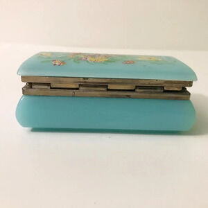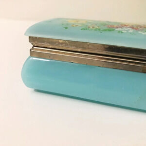 Vintage Trinket Box Blue Plastic Hong Kong Hinged Floral Case Flaws