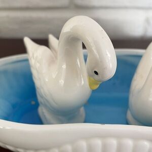 Has flaws in glazing inside the dish, see pictures. One of the swans has the glaze missing around the beak and not that noticeable by looking at the dish. This is an interesting looking dish.