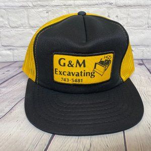 Vintage Trucker Hat Mesh Cap Snapback Black Yellow G&M Excavating Patch Logo 80s