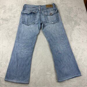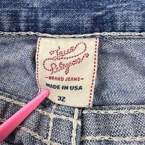 Vintage True Religion Made in USA Men's Size 32x27 Billy Big T Distressed Jeans zipper fly in good pre owned condition as shown in the photos with one stain on the back of the right leg as shown in the photos.