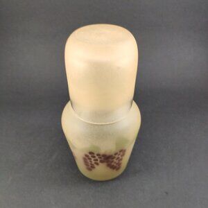 Printed Frosted Glass Night Table Carafe, Tumble Up, Coral Pink with Grape Prints along the Bottle, 7.5 inches in height and 3.75 inches in diameter at its widest. Very Good Vintage condition, no chips, no cracks, and no visible wear marks. Please see pictures for further details