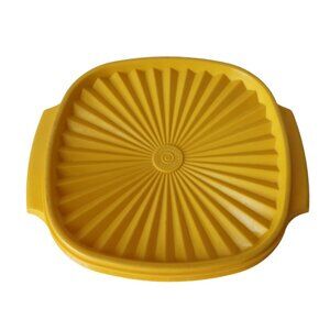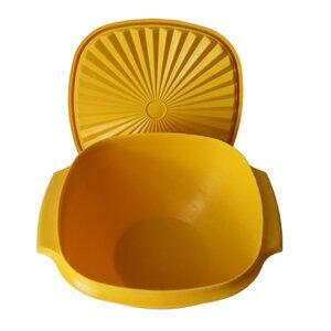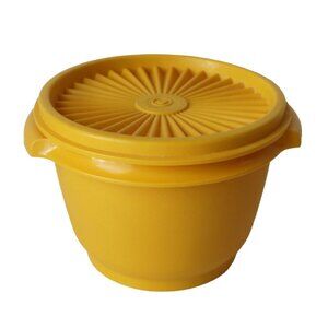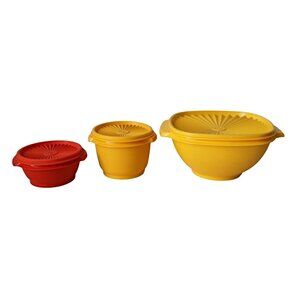 For your consideration are three vintage Tupperware bowls that offer durable and reliable storage with a classic design. Featuring vibrant yellow and orange hues, these retro bowls come with secure-fitting sunburst-patterned lids, ideal for keeping contents fresh. Constructed with sturdy plastic, they are perfect for organizing, serving, and preserving food in style.