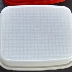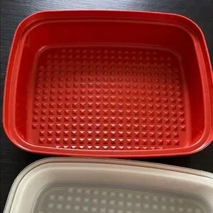 Keep your food fresh with this durable red and white food storage container. Perfect for home kitchen use.