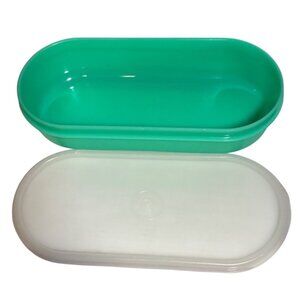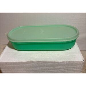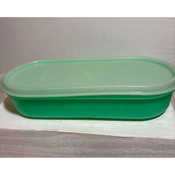 This vintage Tupperware container in jadeite green is perfect for storing cheese or other kitchen essentials. It includes a lid but does not have a grater. Ideal for collectors and vintage kitchen enthusiasts.
