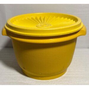 This vintage Tupperware bowl, crafted in Canada, showcases a vibrant yellow hue and a textured lid for secure storage. Its durable plastic construction ensures long-lasting use, making it a reliable addition to your kitchenware collection.