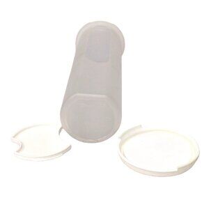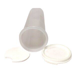 A classic pasta or spaghetti storage container from Tupperware, just the perfect size. This one is clear with a white lid. It is good for at least 1 package of spaghetti. Marked on the bottom: Tupperware Made in USA 4 3/4 cups 1.1 liters. The lid fits well.