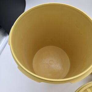 Set of vintage yellow storage containers with floral design. Perfect for kitchen organization.