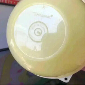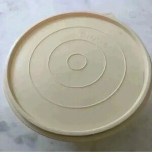 This classic opaque yellow Tupperware bowl is in good preowned condition with surface scratches consistent with use but no cracks or melts. The lid is NOT Tupperware brand, but Frig-O-Seal, which produced pieces meant to be compatible with Tupperware (kind of like off-brand Lego).It’s a fun retro piece in its own right, and it fits tightly on the bowl.