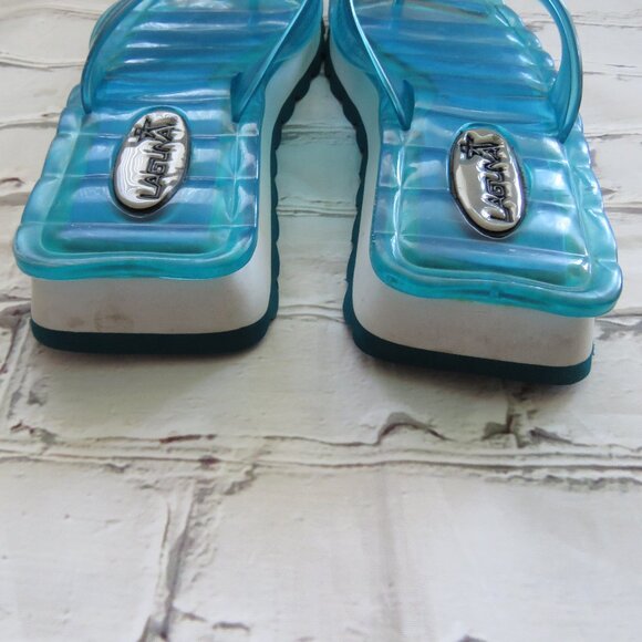 Check out these blast from the past! Laguna turquoise wedge flip flops. I believe these are made from plastic mostly. These flip flops have some thickness and durability to them. They are women's size 9-10. These have a bit of height to them due to the wedge heel. These were worn once indoors then tucked away for another day that never came. So time to send them out in the world to be loved. They are in very good condition. There is only a slight bit of discoloration on the white portion of the wedge part of the heel.
